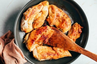 - Season both sides of the chicken breast with garlic powder, salt and pepper. To cook the chicken, you can either grill it on an indoor or outdoor grill or sear it on the stovetop. To sear: add 1-2 teaspoons olive oil to a large skillet over medium heat. Place chicken breast in hot oil. Cook chicken about 6–7 minutes on each side, or until juices run clear. Remove from skillet and let sit for 5 minutes to cool before slicing for the salad. This step can be done in advance, and you can cook multiple chicken breasts together if you’re meal prepping.